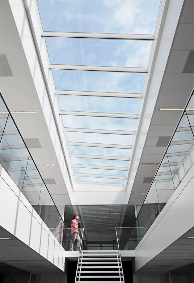 A Longlight solution is a single row of modules that lights up hallways, corridors and large rooms with natural daylight. Multiple rows of Longlights form an ideal glass roof for large open areas, e.g. atriums.