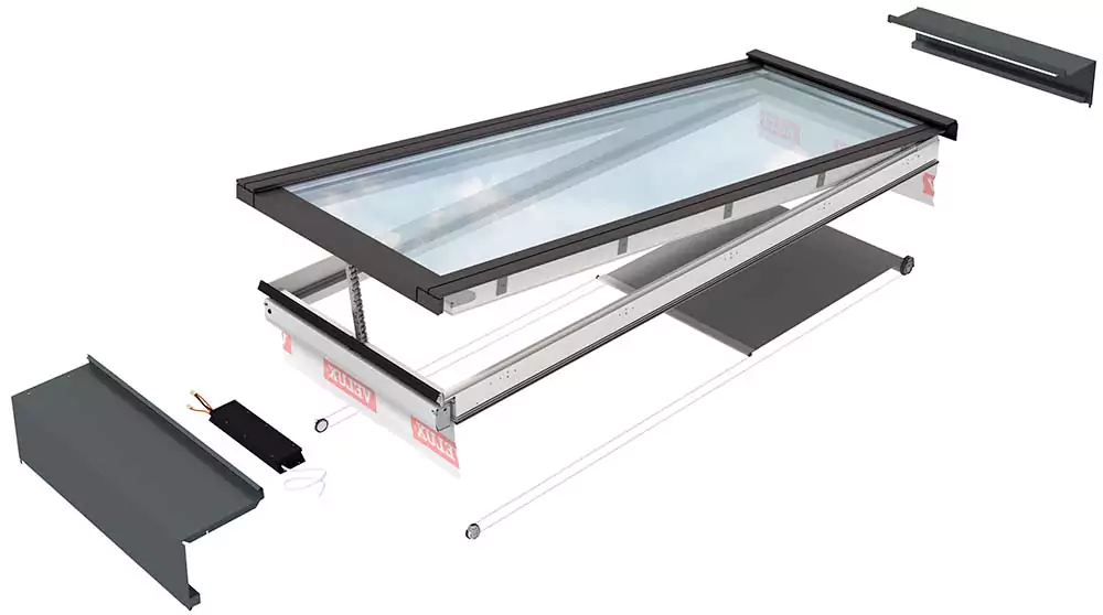 2. Motorized comfort venting skylight module. Actuator chain stroke 260 mm.